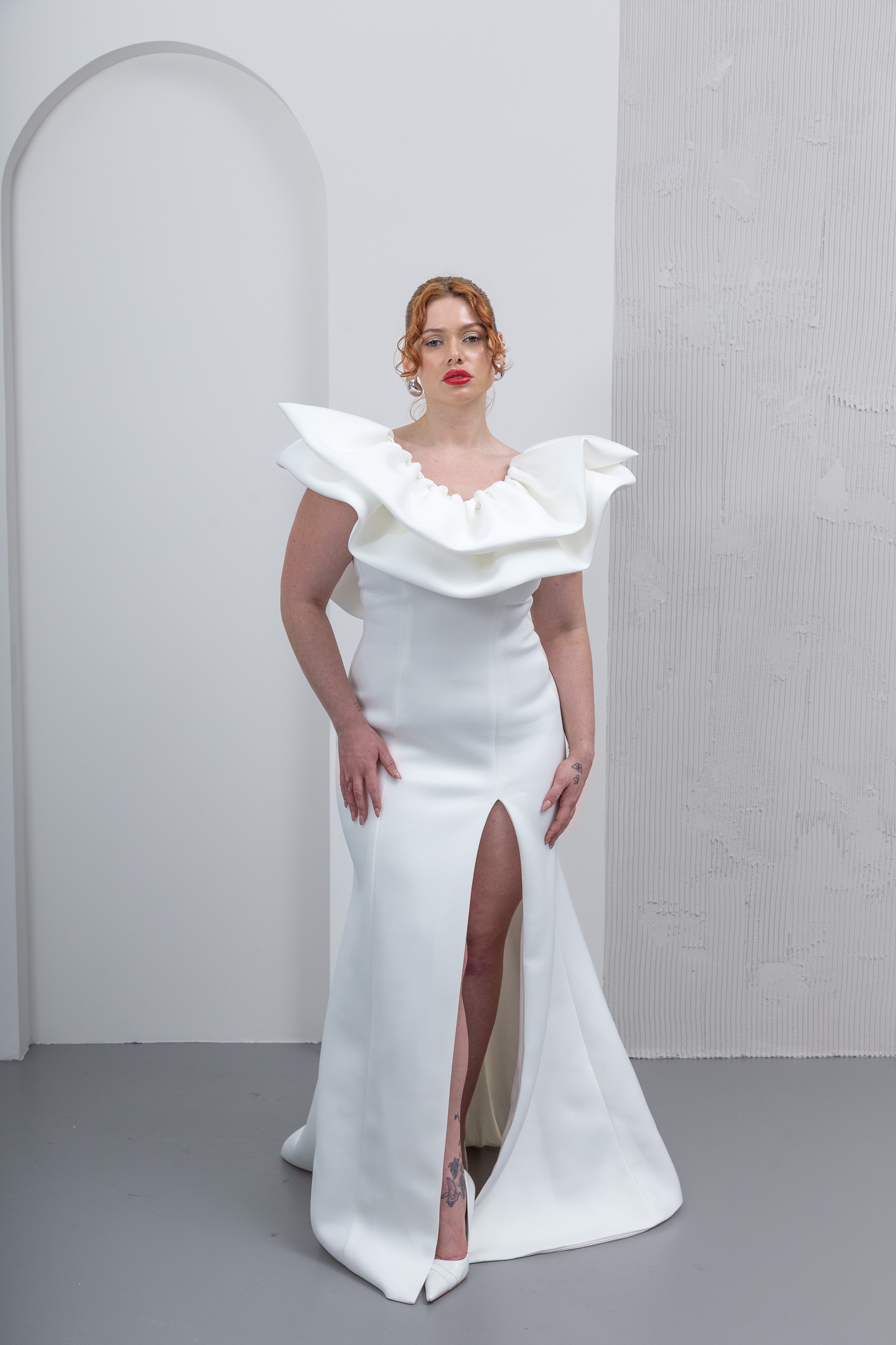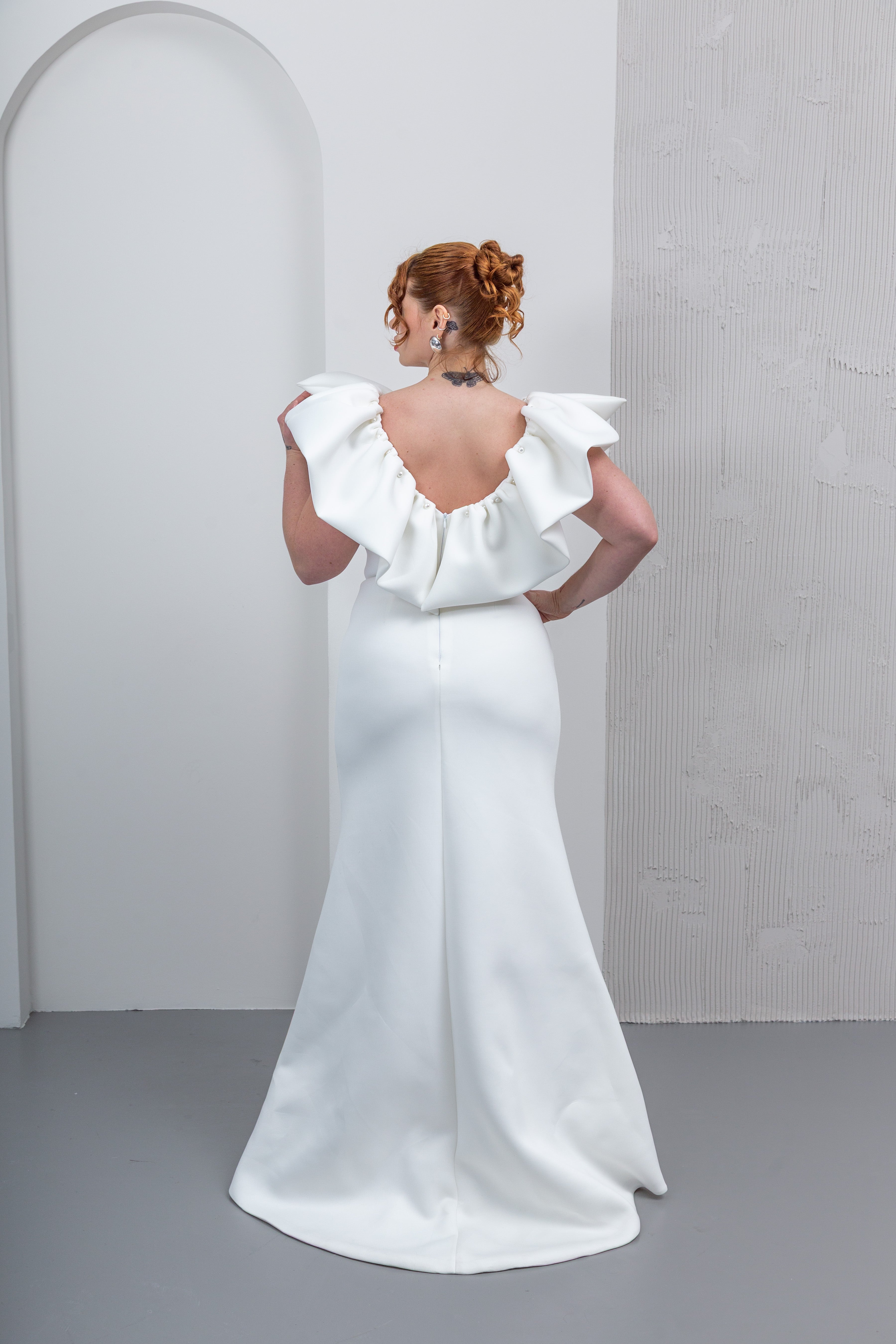 A sophisticated scuba wedding gown that blends structure and softness for a refined, elegant bridal look. Lined with lightweight jersey for added comfort.