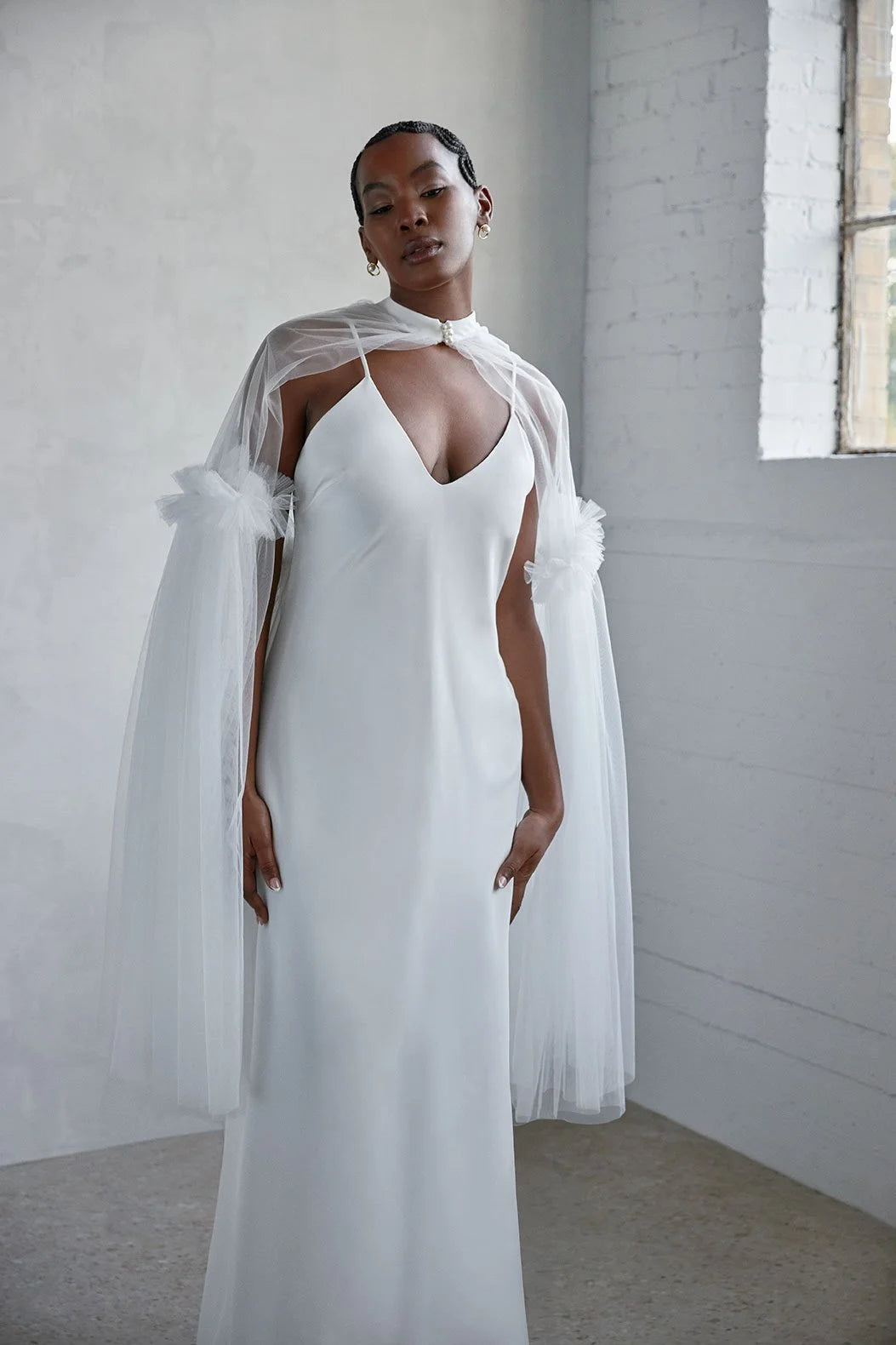 A graceful silk gown paired with a detachable cape for a light, ethereal touch. This looks combines dainty details with timeless charm. Made in Canada.