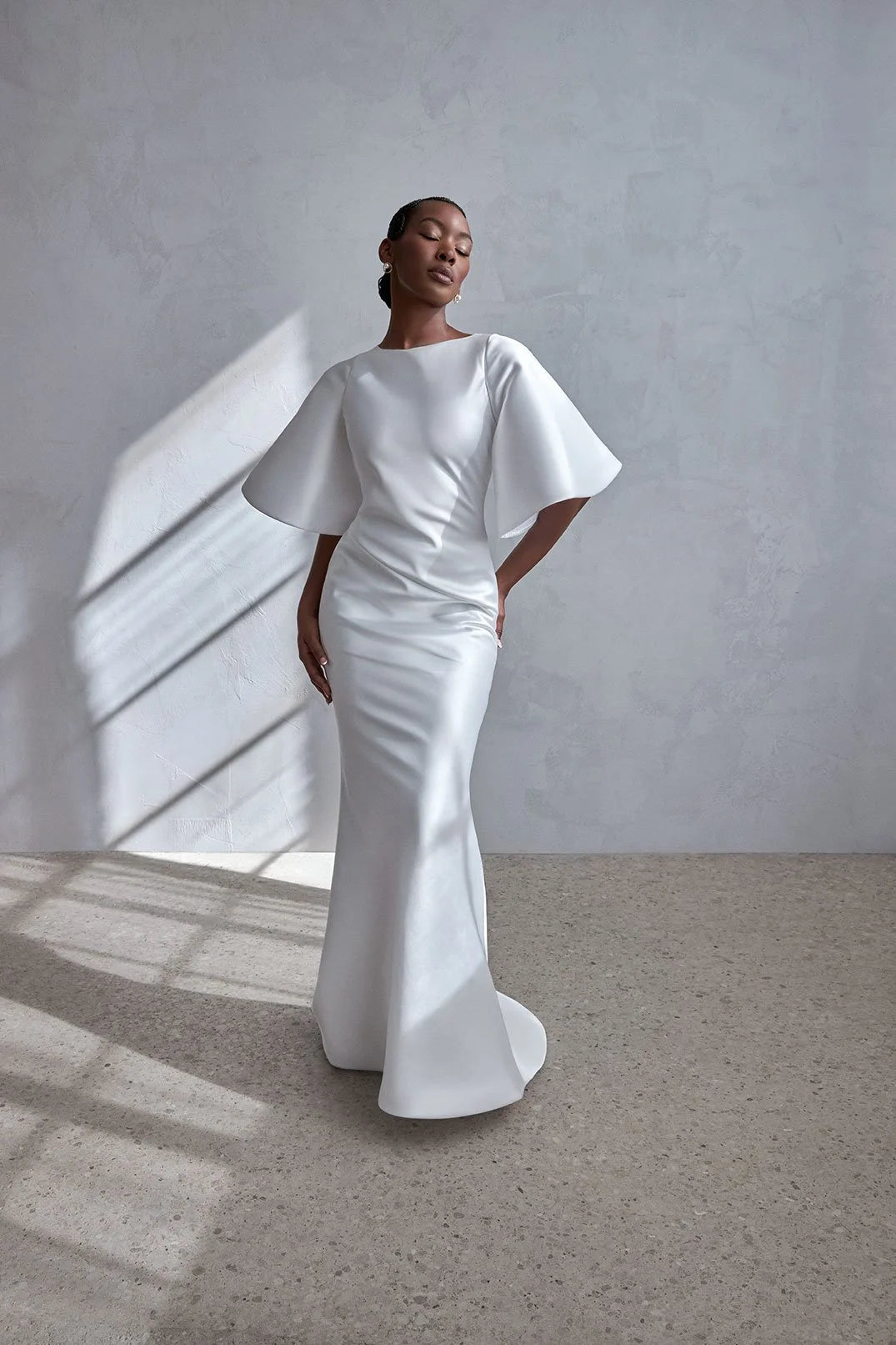This striking design offers a modern, refined silhouette for your special day. A bold, structured bridal gown crafted from luxurious Mikado fabric and fully lined with Bemberg fabric for added comfort. Made in Toronto, Canada