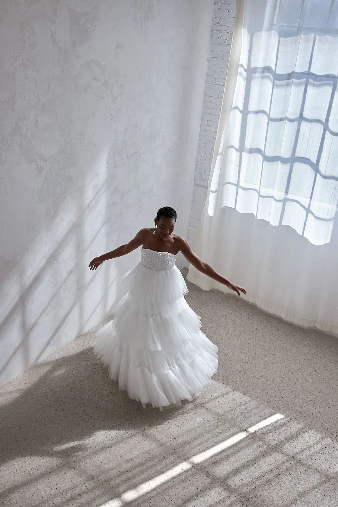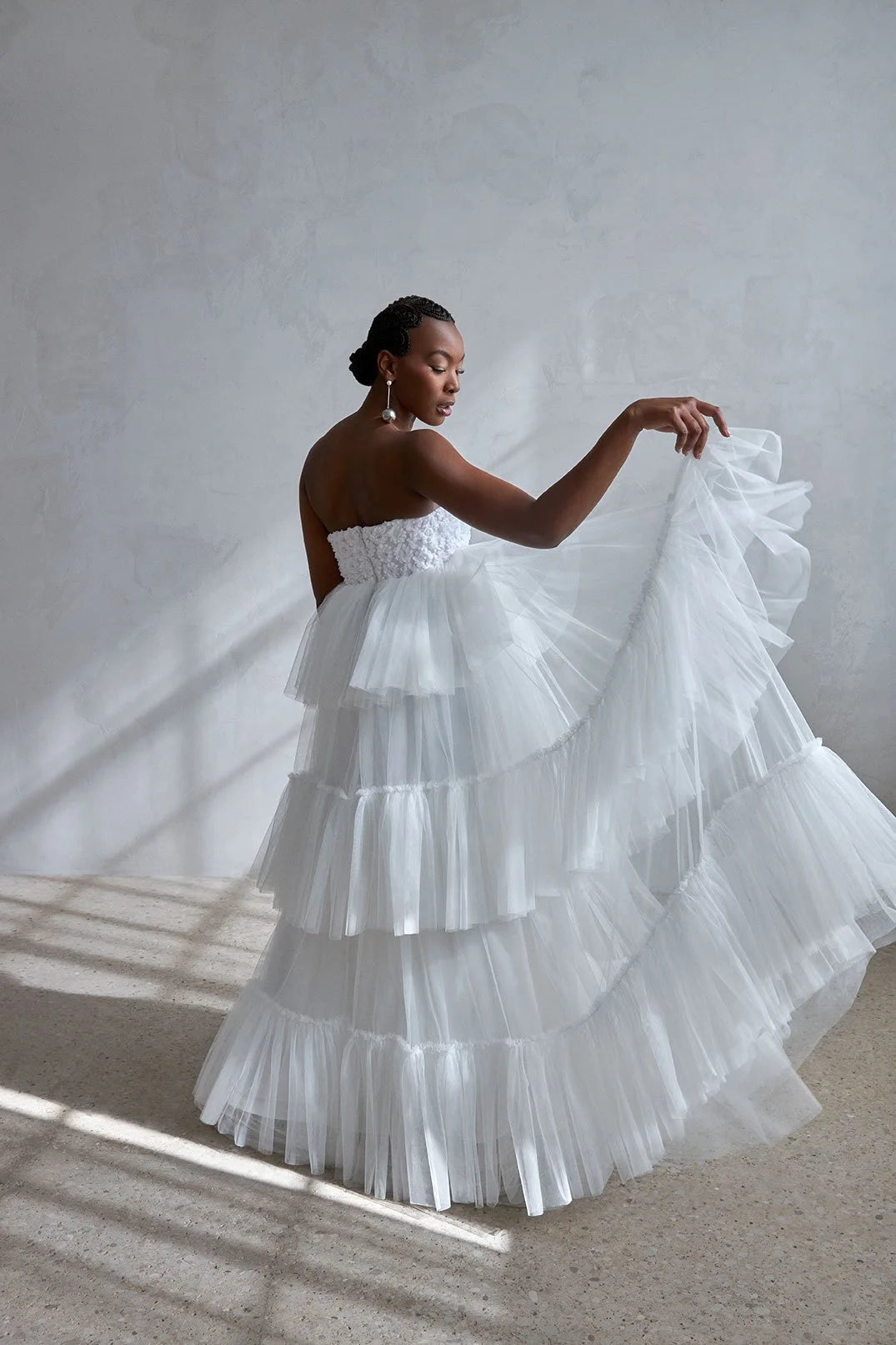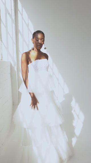- Voluminous three-tiered tulle skirt for a fairy-tale feel