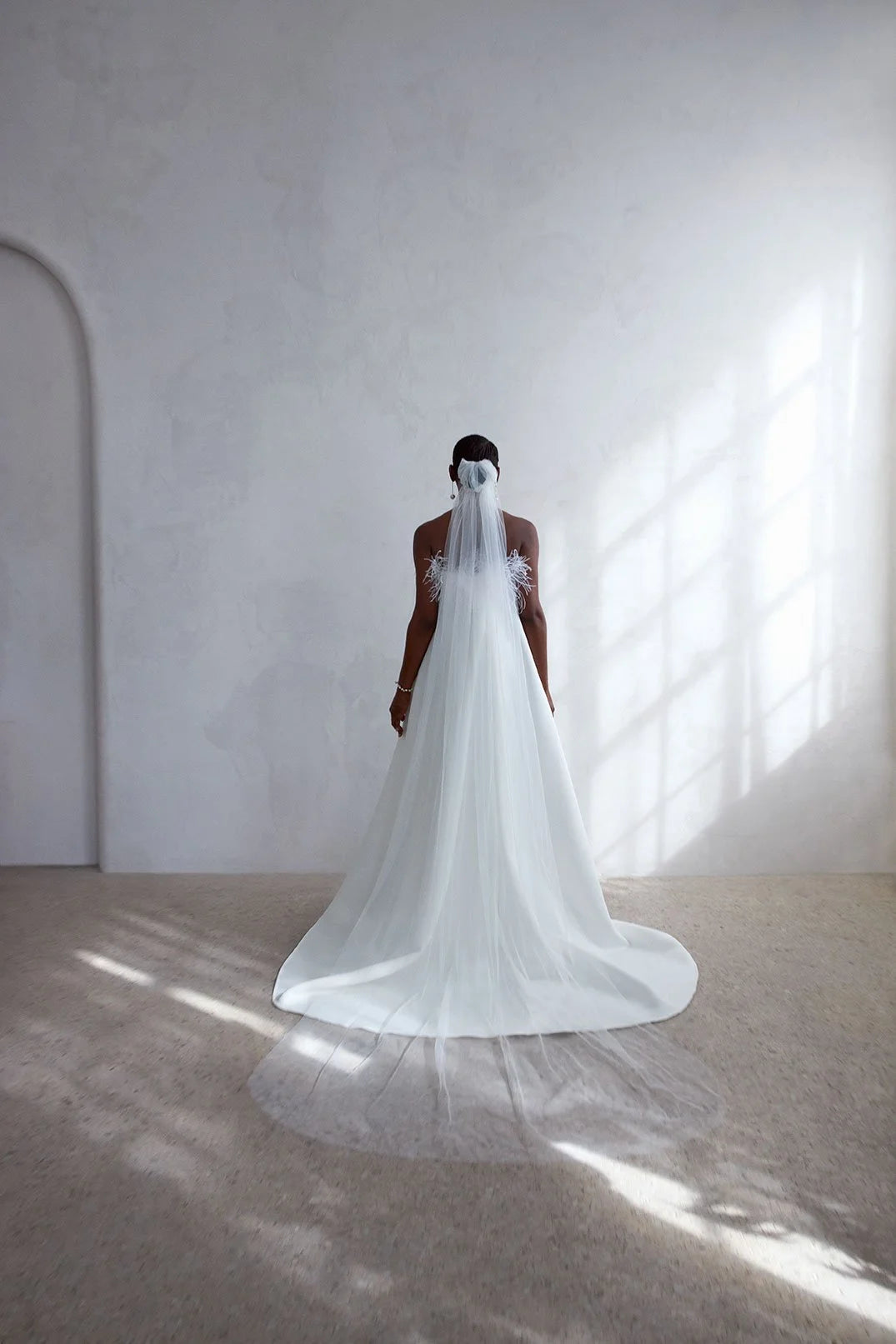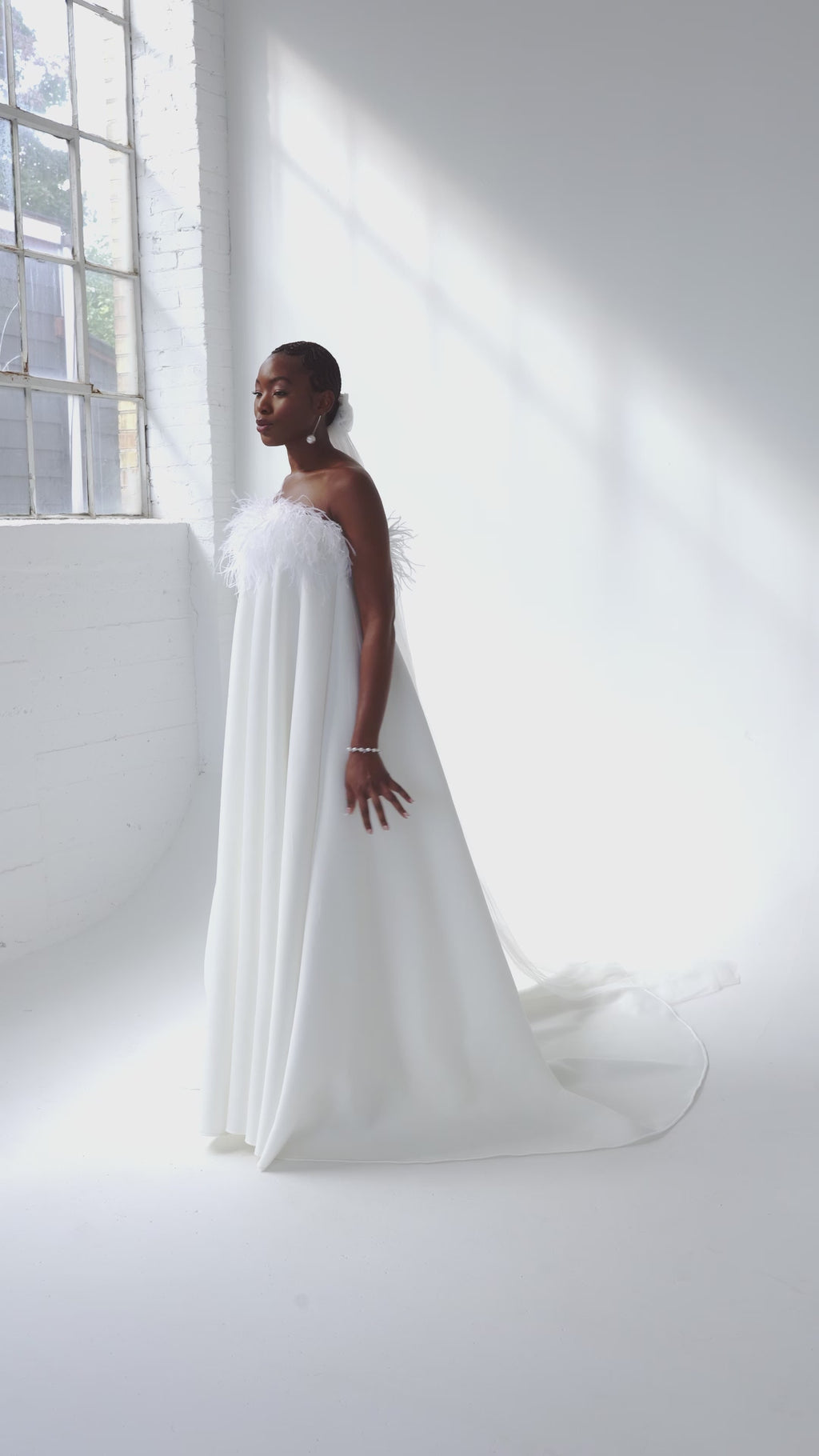 A minimalist strapless bridal gown that combines striking elegance with a refined silhouette. Crafted from structured scuba fabric, this gown is fully lined with Bemberg fabric for a smooth, comfortable fit. Made in Toronto, Canada