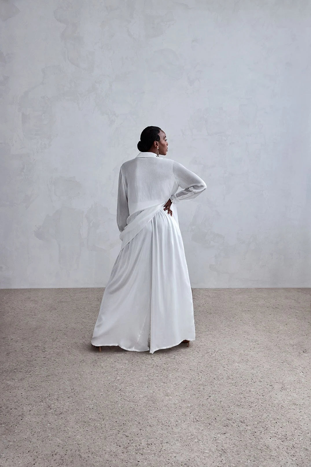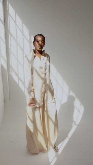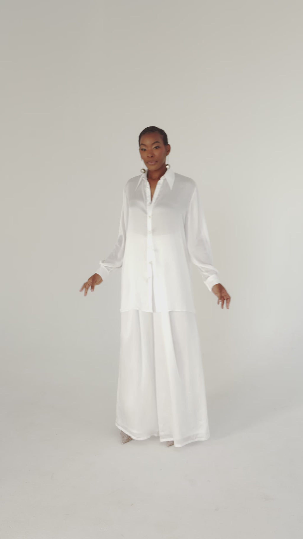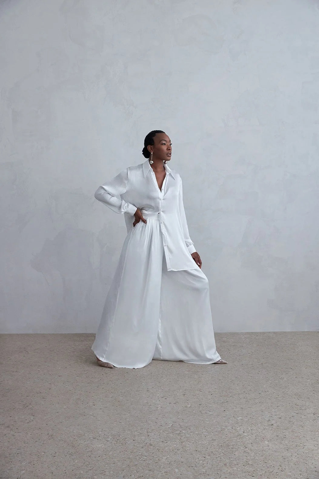 A refined silk pant and shirt set available in elegant white and champagne. The shirt is designed to fall gracefully to mid-thigh and pairs effortlessly with the silk palazzo pants, offering a relaxed yet sophisticated bridal look. The pants are fully lined with Bemberg fabric for added comfort. Made in Toronto, Canada