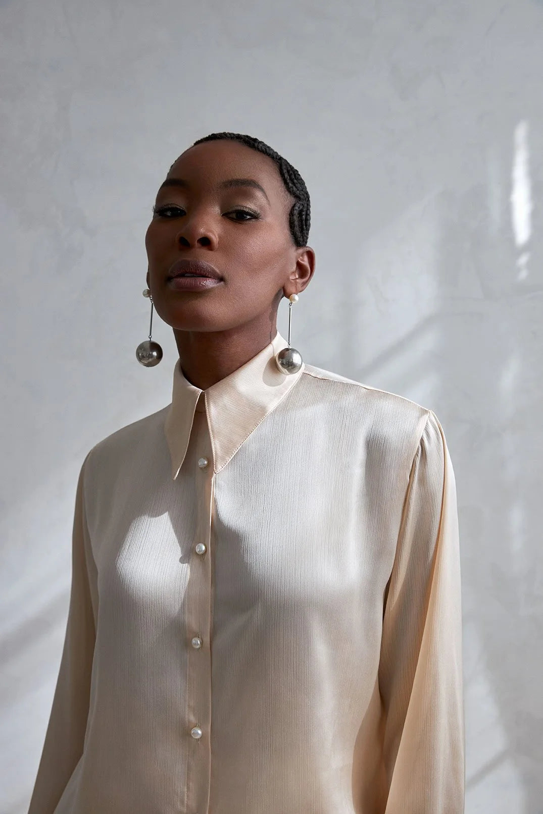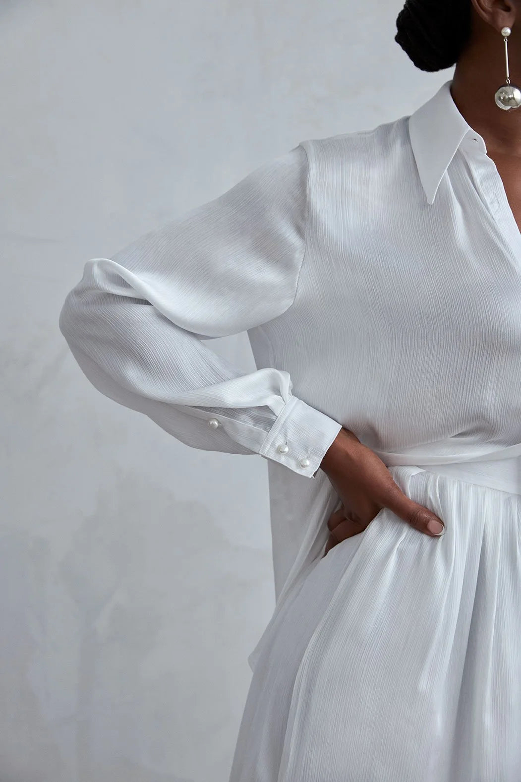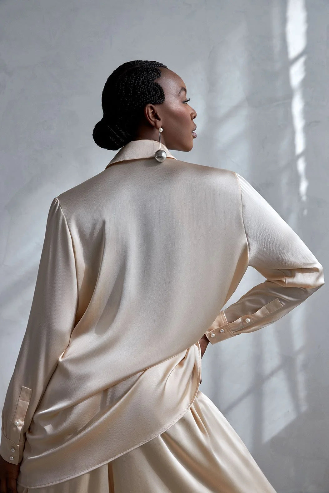 A refined silk pant and shirt set available in elegant white and champagne. The shirt is designed to fall gracefully to mid-thigh and pairs effortlessly with the silk palazzo pants, offering a relaxed yet sophisticated bridal look. The pants are fully lined with Bemberg fabric for added comfort. Made in Toronto, Canada