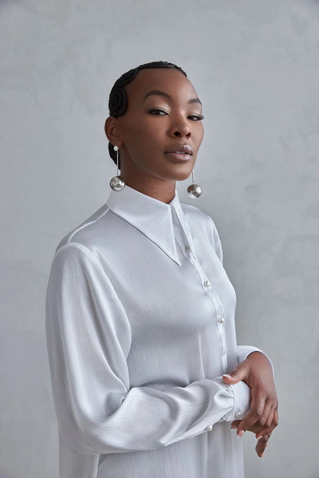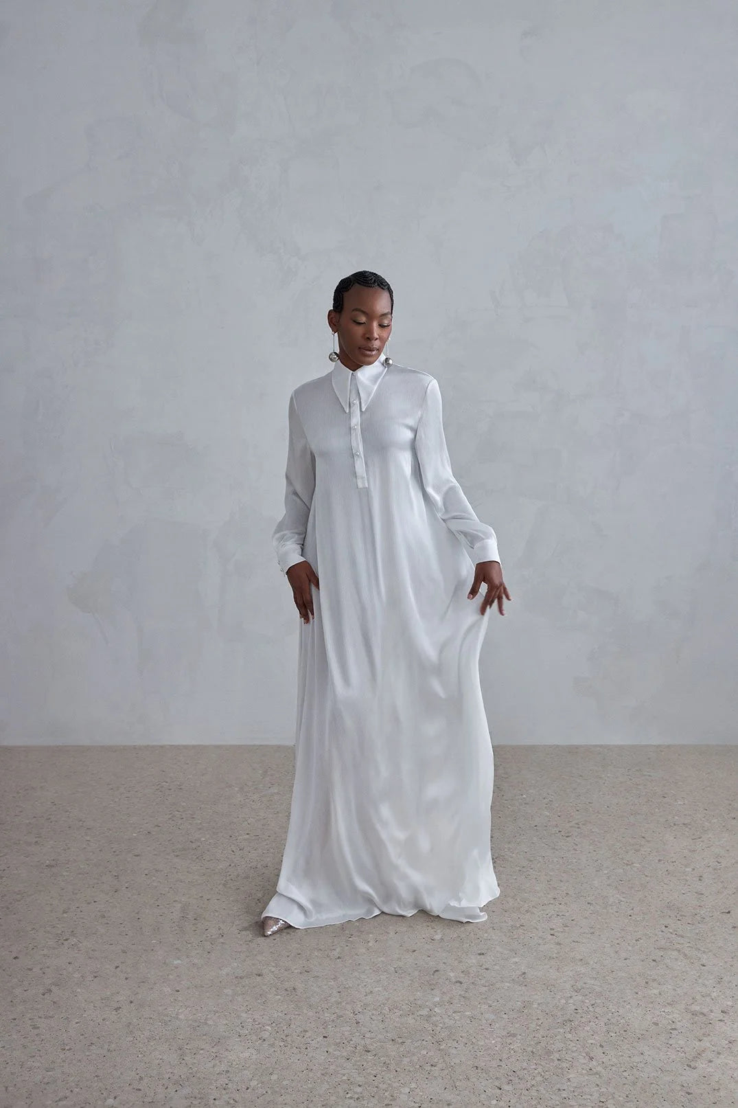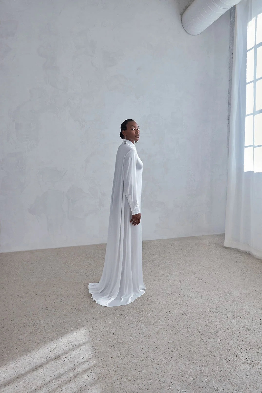 A classic A-line shirt dress crafted from shiny silky crepe, offering a soft and flowy feel perfect for a sophisticated yet relaxed bridal look. This dress features a sheer design that gently flows into a soft train, creating a graceful and elegant silhouette.