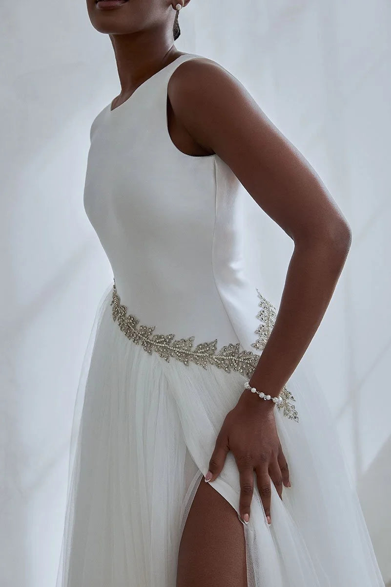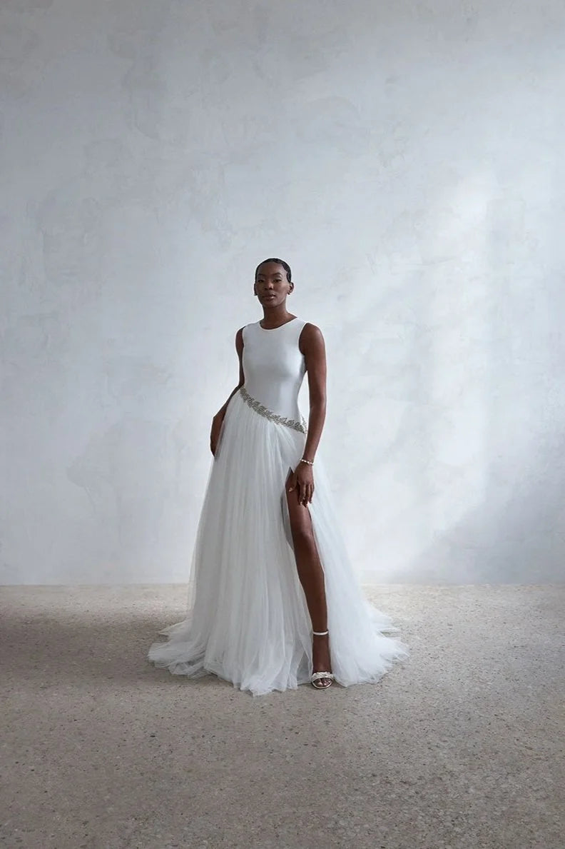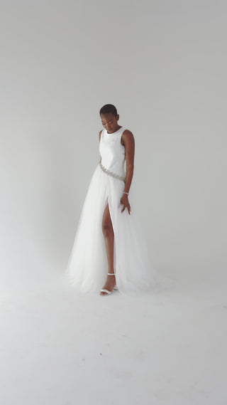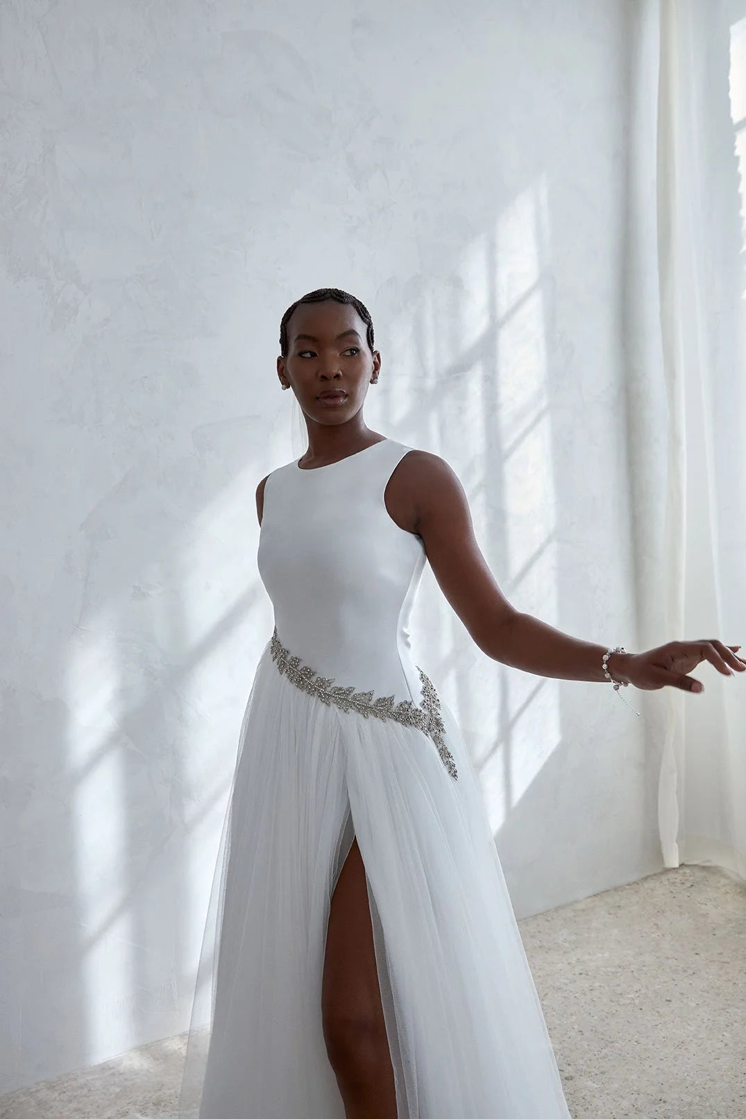 With soft and asymmetric lines, this gown radiates romance and grace. A long side slit for a sexy moment.